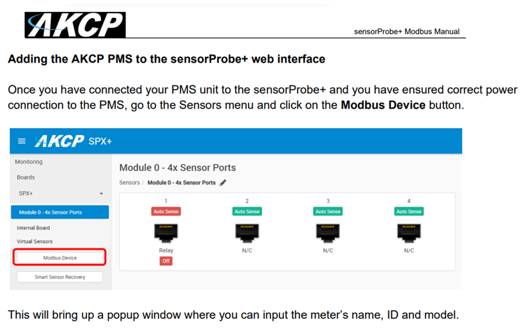 Please refer to the section “Adding the AKCP PMS to the sensorProbe+ web interface” in the Modbus manual we provided earlier for the full step-by-step instructions.