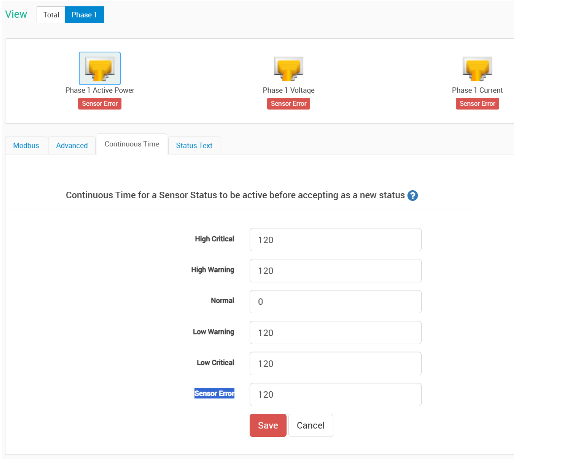 4. Adjust Continuous Time: Since the polling interval is 15 seconds, we suggest setting the Continuous Time for the Sensor Error status to 120 seconds. This allows the SPX+ to retry communication multiple times and only trigger an “Error” status if the failure persists for more than 2 minutes. Please reconfigure this for all sensors on the PMS as shown below in the SPX+ web UI.