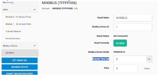 3. Adjust the PMS Modbus Settings: Set the Execution Timeout to 5 seconds and Retries to 3 as shown below in the SPX+ web UI.
